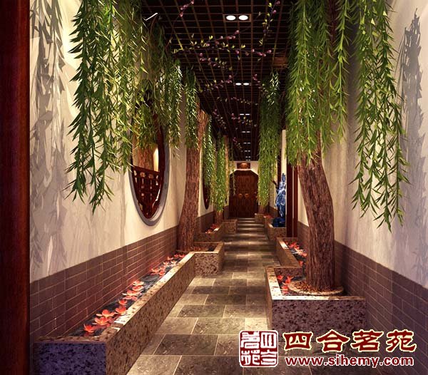 走廊效果:滿廊春意白墻柳,桃花落,閑池意山皆藏酒
